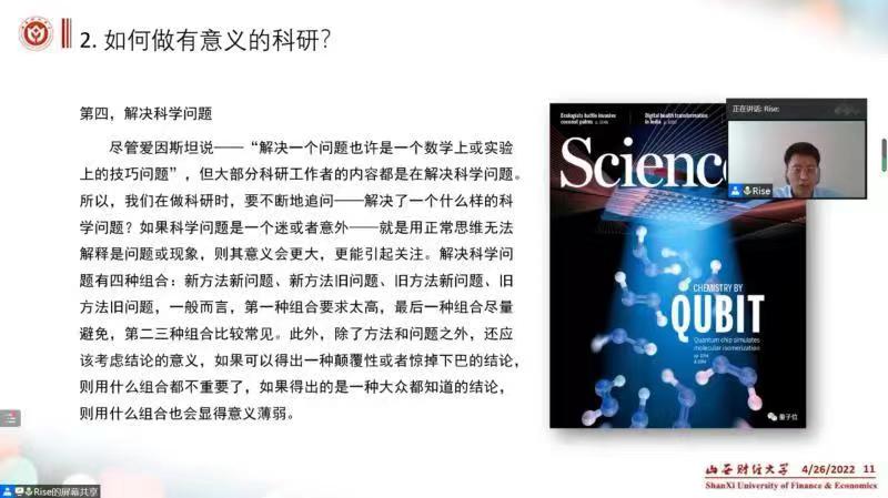 李俊明老师以《科研与人生——如何写出好的科研论文》为主题,从科研的意义、如何做有意义的科研、如何写出好的科研论文三个方面展开讲解。他首先提出人生的意义是什么?通过解读人生的意义引出科研的意义,即科研是一种科学思维的训练、是一种解决问题的能力、是一种生存生活的技能、是一种获得智慧的途径。那么如何做有意义的科研呢?李老师指出,要能创造新的思维、发现新的现象、提出新的问题、解决科学问题、研发新的方法和创造新的价值。对于如何写出好的科研论文,李俊明老师强调了选题的重要性,好的选题是成功的一半,要从中国实际出发,找有意义的研究选题。不仅如此,还要做好文献回顾与研究设计,尊重写作规范,认真做好图表。最后,李俊明老师结合优秀案例对统计专业的论文写作作了针对性的指导和总结,提出可行性建议。