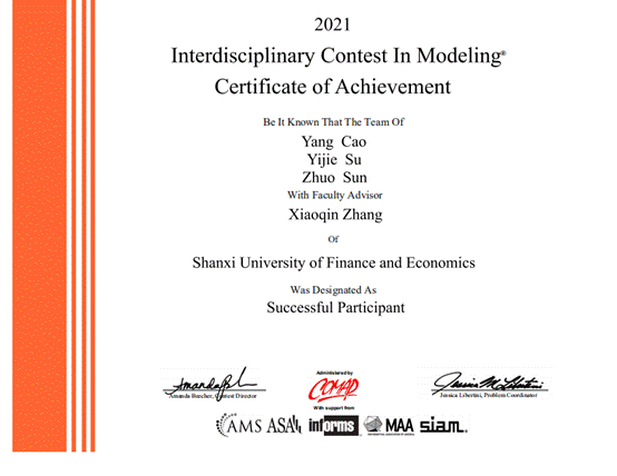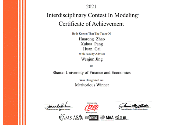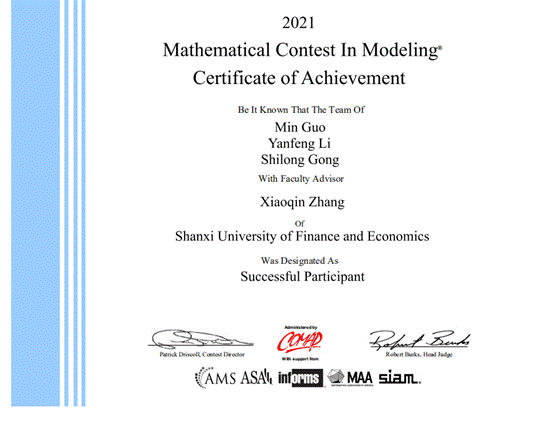 组织张晓琴、陈佳佳、荆文君老师带队的四个参赛队伍取得优异的成绩,分别荣获一等奖(Meritorious Winner)1项、三等奖(Successful Participant)3项。