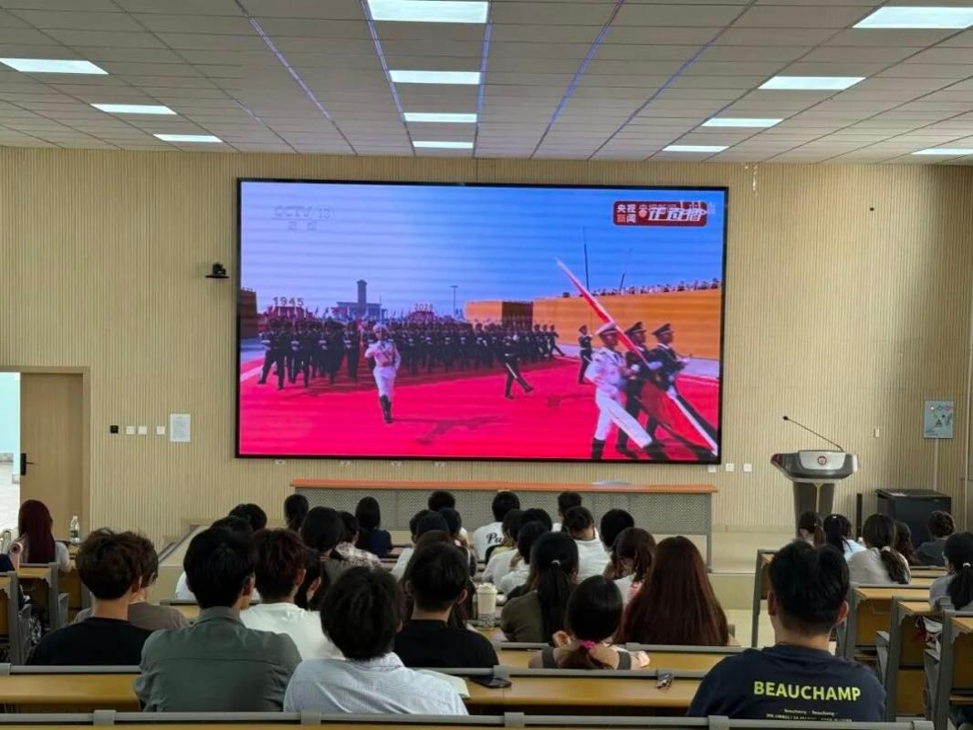 组织学生党员和主要学生干部在修德楼202阶教集中观看纪念中国人民抗日战争暨世界反法西斯战争胜利80周年大会视频,回顾习近平总书记重要讲话和检阅部队实况,共同铭记历史、缅怀先烈、珍爱和平、开创未来,从伟大胜利中汲取力量,在伟大征程中挺膺担当!